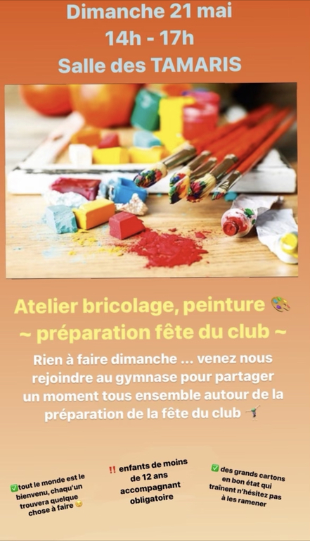 Venez partager un moment convivial afin de préparer les décorations pour la fêt du club qui se tiendra le samedi 24 juin.