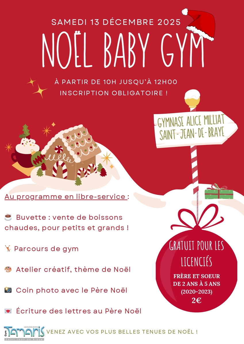 Contrairement à ce que nous avons pu vous annoncer en début de saison, la fête de Noël pour les groupes APE et BabyGym aura finalement lieu le samedi 13 décembre de 10h00 à 12h00 au gymnase Alice MILLIAT à SAINT JEAN DE BRAYE.